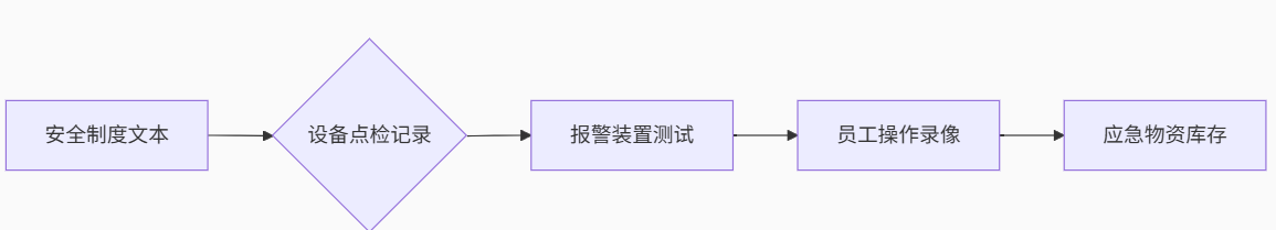 | 机械安全 | 1. 防护装置拆除审批 2. 设备点检原始记录 3. 安全锁具分配清单  | 视频监控录像抽查 点检仪数据导出分析  |